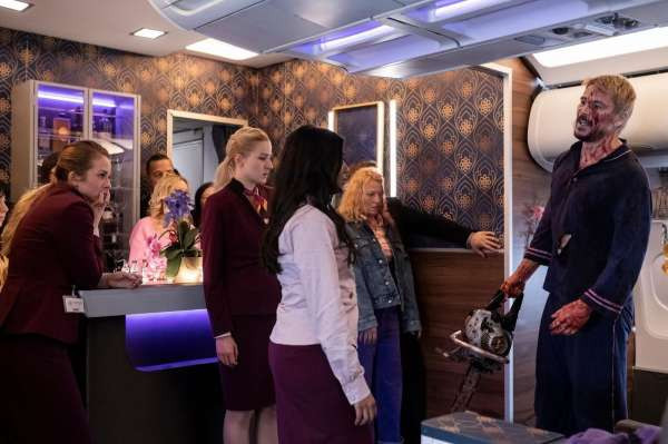 Да, «Рейс на вылет» — это сугубо развлекательное кино, что сразу понятно по открывающей сцене, где происходит самая настоящая кровавая свалка под классическую музыку. Всё однозначно плохо, но губы сами в улыбке растягиваются, ведь абсурдность происходящего зашкаливает.