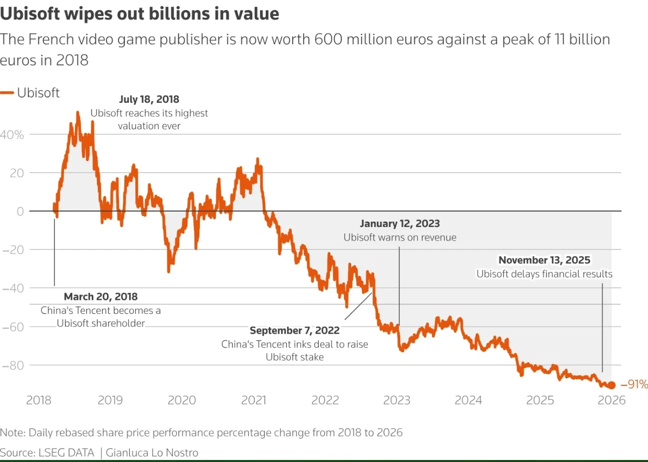 Неудивительно, что текущее положение дел со стоимостью Ubisoft на бирже решили сравнить с показателями 2018 года — тогда французский издатель находился на пике. Постепенно акции компании падали, дойдя до текущих значений. За 8 лет стоимость компании упала на 91% вплоть до около 600 миллионов евро.