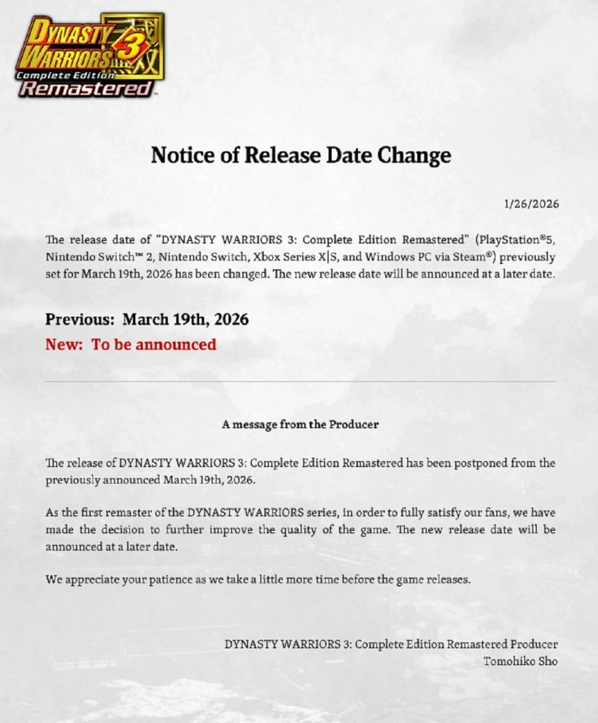 Также стало известно, что продажи Hyrule Warriors: Age of Imprisonment превысили миллион копий с момента релиза на Nintendo Switch 2 в ноябре 2025 года. А релиз Dynasty Warriors 3: Complete Edition Remastered перенесли с 19 марта на более поздний срок. Новую дату выхода экшена на PC, PlayStation 5 и Nintendo Switch объявят позднее.
