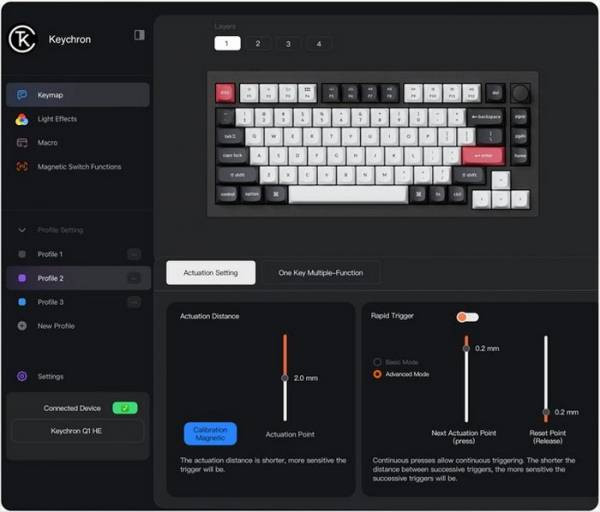 В составе Keychron Q1 HE используются переключатели Gateron 2.0 Hall Effect Magnetic Switch. По сравнению с традиционными механическими переключателями уникальная особенность переключателей с эффектом Холла состоит в том, что они способны различать разные степени нажатий от лёгкого до полного.
