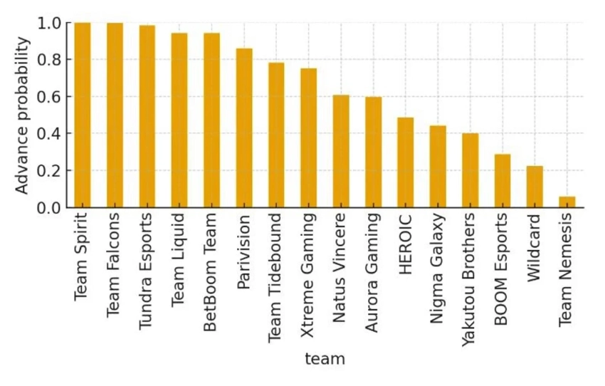 - Дополнительно автор прогнал ещё 200 000 сценариев, чтобы оценить, кому чаще всего «светит» идеальный выход 4:0: на первом месте снова Team Spirit, следом — Falcons и Tundra.