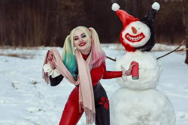 Редкое сочетание: Харли Квинн и зима. В Готэме снег редкое явление, тем более полноценные сугробы. У Виктории Кот вышел креативных образ.